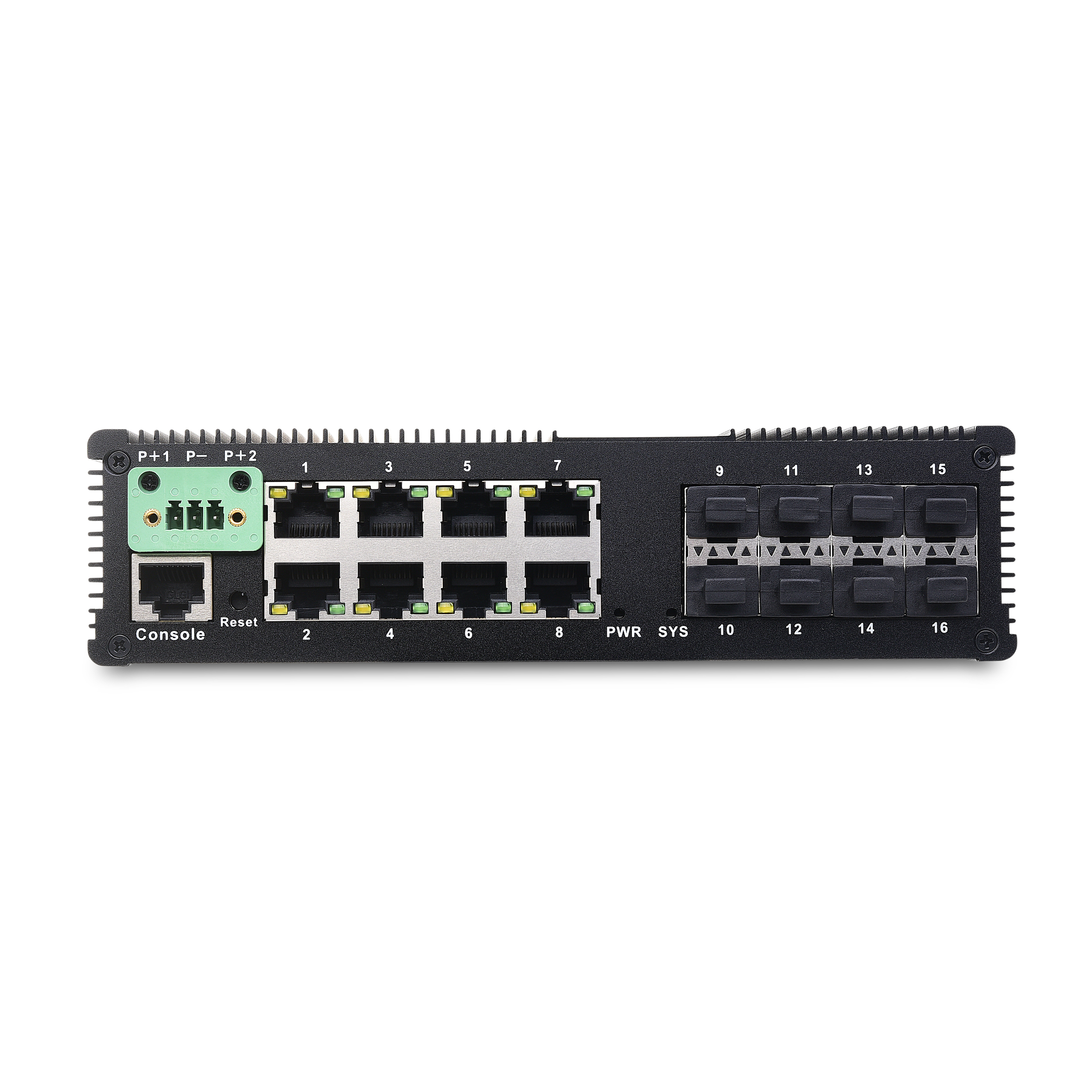 该系列是我司自主研发的一款管理型工业级二层万兆光纤以太网交换机,千兆8光8电,支持 8个100/1000 SFP光口+8个10/100/1000 Base-T 自适应 RJ45 端口。千兆8光8电完全遵循工业产品设计与用料,外壳采用导轨式设计,宽范围工作环境温度、DC10-55V双电源冗余等技术,提供了耐高/低温、防雷等卓越的工业级品质;支持强大的管理功能,包括系统管理,全面二层管理功能,QOS队列管理、全面的网络安全管理和监测维护管理;工业级的三级 ESD保护其适合多种场合,例如智能交通、室外监控、工业网络、平安城市和其他恶劣环境中的部署要求,该产品同时采用无风扇、低功耗、工业级设计,-30至75℃工作温度范围,能够满足各种工业现场的要求,提供经济的解决方案。 该设备可广泛应用于智能建筑,智慧城市,智慧社区,智能交通、电信、安防、金融证券、海关、海运、电力、水利及油田等各种宽带数据传输领域。